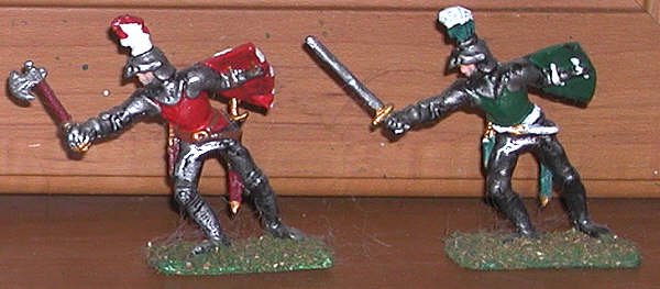 Here we have that Deetail knight again. He is one of the few in that set that is close to historical authenticity. A little paint and a weapons swap yields a nice variety of figures. A very serious group of knightly collectors insist that the heraldry and colors of their knight be true to real individuals. Medieval heralds kept such good records that heraldric miniature knights can be produced. My knights are not heraldric. I know a few basic rules of heraldry and I paint accordingly.