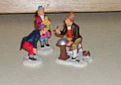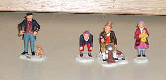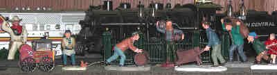 None of these figures are a set, as sold. However, the five workmen on the right are placed so as to make a set. They fit together well as a group hauling supplies. I find them particularly useful for freight platforms on train stations. To the left is a peanut vendor with his cart - these two can add color to a scene. They are a set, in themselves. Far left is a figure you may have seen - an old tin cowboy. He is like the type seen in early movies. Not part of any scene, he happened to be in place when the picture was taken. |