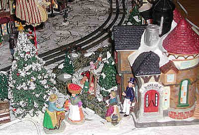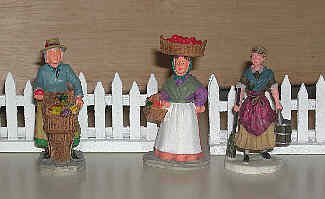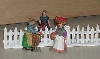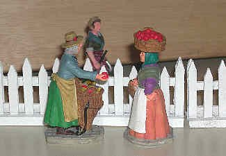 These three figures are particularly good. Their attire, poses and detail make them prime examples of what a miniature should be. Note three different body types: large, heavy and slim. All three remain proportional. Their poses and accouterments identify them and their activity: apple vendor, shopper and cleaning lady. |