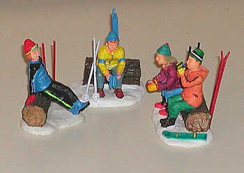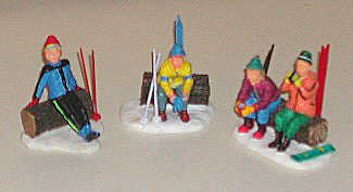 The skiers are posed as if sitting around a campfire. In Winter scenes, these are among the few figures that look appropriate sitting outdoors. This open placement is semicircular, allowing a good view of the pieces as well as fitting a "`round the campfire" situation. |