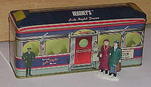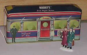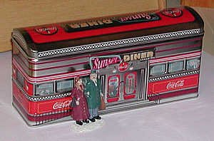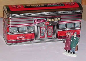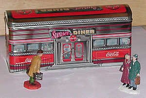 Our Diner tin is scaled smaller than our people, and the diner has people lithographed on its side. We have two reference points to overcome: too-small doorways and too-small people. Placement close to the door makes our standing figures look too large. The same goes for placement too close to the lithographed human images. |
