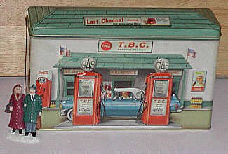 This gas station is lithographed with its own perspective. The result: the pumps loom larger, the doorway smaller, and the car just the right size for our figures. The reference point is the pumps, especially the pump handles. Figures placed here look undersized. However, such placement would be tolerable in a pinch. |