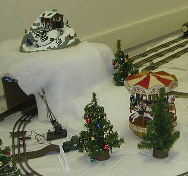 The skier accessory is atop the hill, and near the foreground is a Victorian carousel. Another trolley comes into view. |