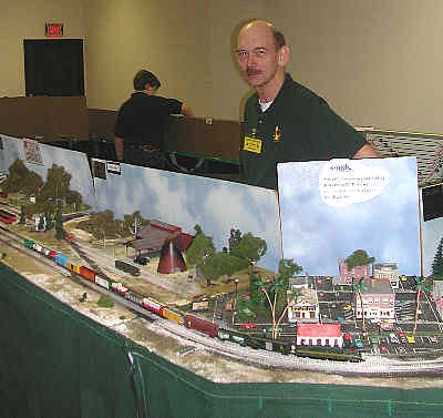 Dave stands behind his corner module, which features a tropical Florida scene complete with miniature palm trees. |