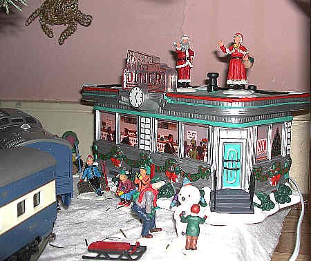 The Diner scene is across the tracks form the Modern Village. The building is of a larger scale than the shops. Here we have modern figures kitted out for winter sports. Skiers relax in front of the diner, while in foreground a man and boy build a snowman. |