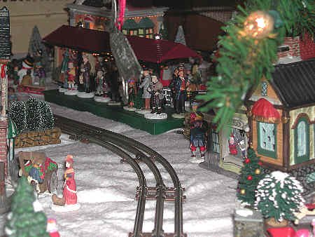 Toy shop - Scandinavian woman to left. To the right are ice skaters and...tin Tom Mix cowboy in white suit. He is an old lead figure, added for fun. In front, Matt and Sean have heard someone yell, "Free train rides," so they are off and running |