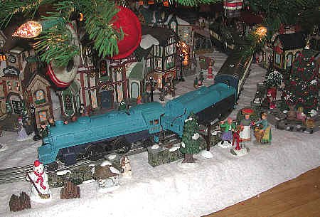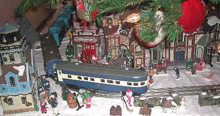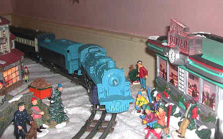This train is a colorful combination. The engine is a Lionel #8303 locomotive from 1973 painted as the famous Blue Comet express train of the old Central Railroad of New Jersey. Well, they call it the Blue Comet, but the one blue it too light, the other blue is too dark, and the locomotive is a bit short. Here at home, it is called the "Silly Blue Locomotive" because it is so funny to watch. We bought a set of passenger cars matched to it, and have had hours of fun running this train.