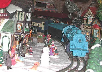 The Blue Train rolls into the center of the Victorian Village. |