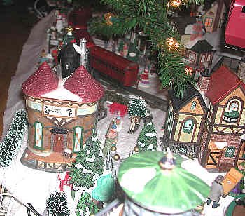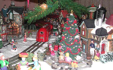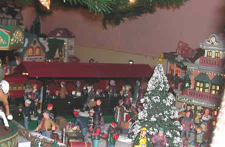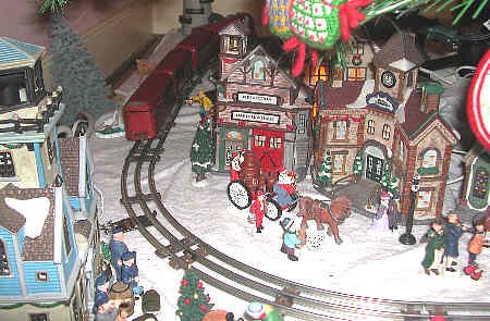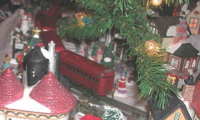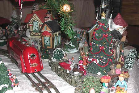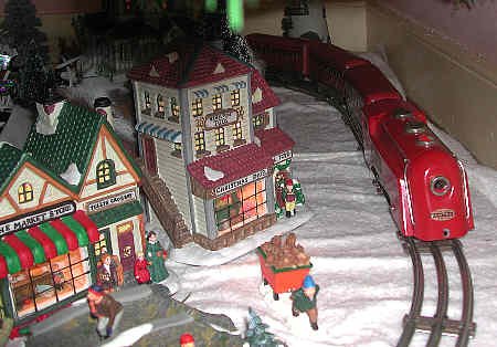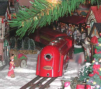 The Red Commodore Vanderbilt Express is a tinplate O27 train which is over 60 years old. It is run with pride because this buzzing, sparing little locomotive is a holiday veteran. The locomotive was restored prior to coming into our hands about four years ago. Cars were acquired elsewhere. You might notice that there is no tender - one day we hope to find a red one for the "Vandy." Tender or not, the Red Commodore Vanderbilt is a special delight to run in our Yule Village.