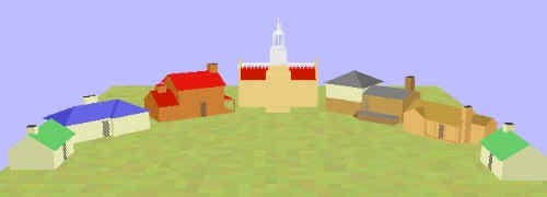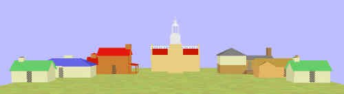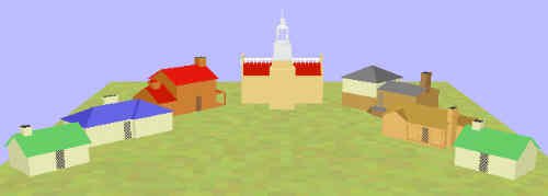 Semi-circular placement with buildings at an angle. This forces the focus to the central building and the area fright in front of it., This is excellent if the emphasis in your scene is intended to be the central building and the activity to its immediate front. |