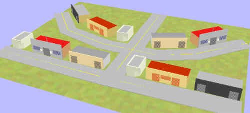 This blends a semi-circular row of structures with a linear row., and is good in cases where the rear line of buildings is backed against a Yule Tree or other obstruction. |